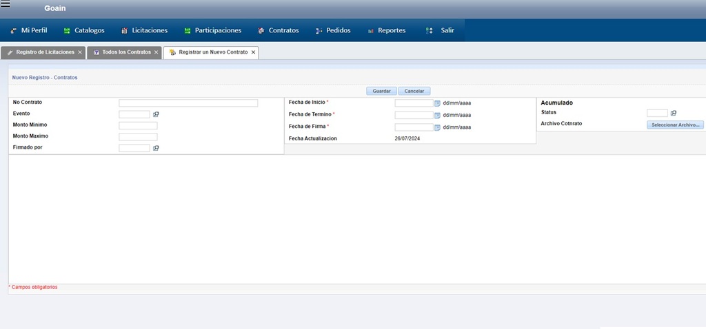 Todos los registros desde las fechas del inicio de cada evento, ya sea una Cotización, una Invitación Restringida, Adjudicación Directa o Licitación, Ampliación de Contratos, con la finalidad de llevar el registro de todo lo que se venda al gobierno.